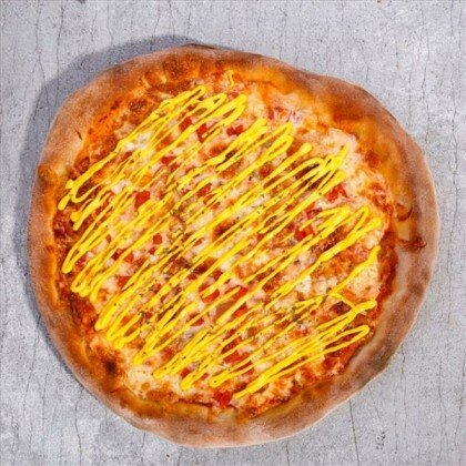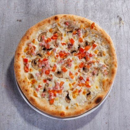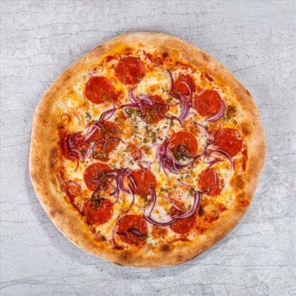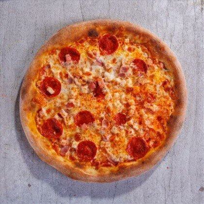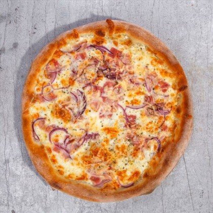 Сочная курочка с беконом под соусом барбекю, свежий лук, сыр моцарелла.(30см)
